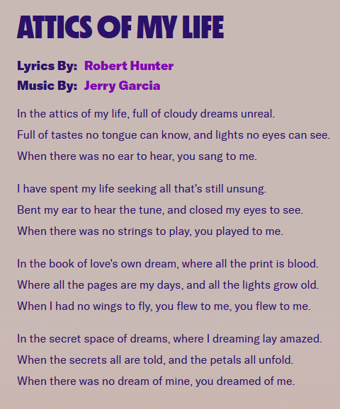 A couple of years ago, I lucked into a musical opportunity that will probably never come my way again: I got to sing back-up harmonies for Bob Weir. OK, it was for Bob Weir and the Marin Philharmonic, and I was one of ten or so singers, but still. Very fun. And the highlight of that highlight of my life was singing the final encore, just Bob and us on the stage proscenium, a capella — “Attics of My Life.”